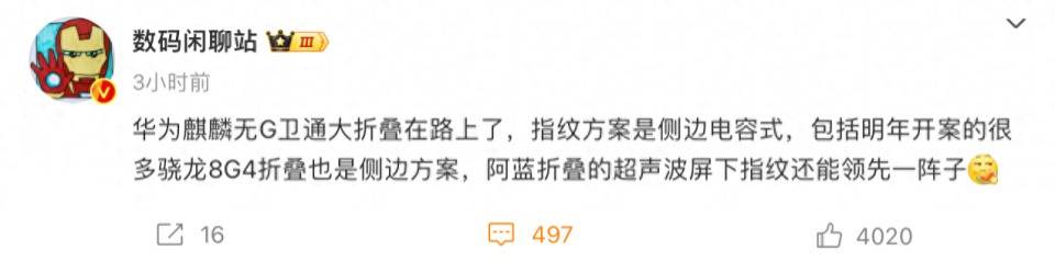 日前,数码博主 @数码闲聊站 爆料称,“华为麒麟无G卫通大折叠在路上了,指纹方案是侧边电容式,包括明年开案的很多骁龙8G4折叠也是侧边方案,阿蓝折叠的超声波屏下指纹还能领先一阵子”。具体来说,该博主曝光的这款华为大折叠新机很可能是接替目前市售的Mate X5的迭代机型“Mate X6”,该机将搭载麒麟处理器,支持“5G和卫星通信”,采用侧边电容式指纹方案。