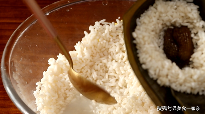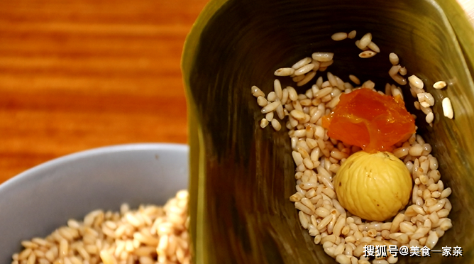 4.糯米、鸡肉、板栗、咸蛋黄(糯米里面加老抽调色)