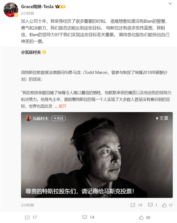 今日,特斯拉对外事务副总裁陶琳,为马斯克的天价薪酬判决案拉票。