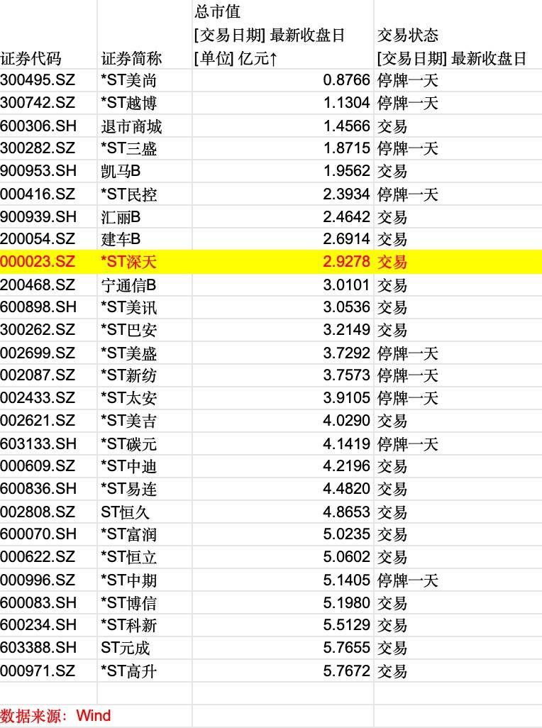 除建车B外,6月4日晚间,A股上市公司*ST深天(000023.SZ)亦发布“市值退市”预警,公司股票已有1个交易日收盘市值低于3亿元。